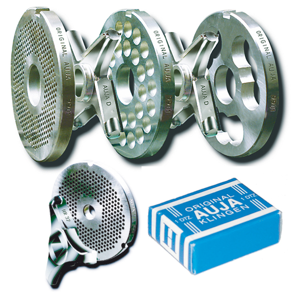 AUJA/WTM-Fleischwolf-Schneidsätze in rostfreier Spitzenqualität AUJA-Messer mit auswechselbaren Steck-Klingen in Kombination mit AUJA-Scheiben ergeben den kompletten, rostfreien AUJA-Schneidsatz. Zeitgemäße Hygiene, beste Schneidqualität, erhöhte Standzeit und einfache, schnelle Handhabung zeichnen die seit jahrzehnten bewährten AUJA-Systeme aus. Lieferbar für alle gängigen Systeme, wie zum Beipiel UNGER und ENTERPRISE. Bitte wenden Sie sich wegen des Teileprogramms direkt an unsere Mitarbeiter.“