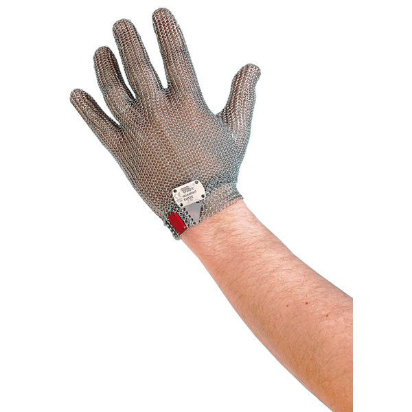 Protective Glove “eco mesh” The “eco mesh” stab-protection glove made completely with metal with the patented ergonomic fit is cost-effective and efficient. The patented fit ensures less stress for boners and butchers. It is universally suitable for right-handed and left-handed users. The ring diameter internal/external is 2.9/4.0 mm and 0.55 mm wire diameter.