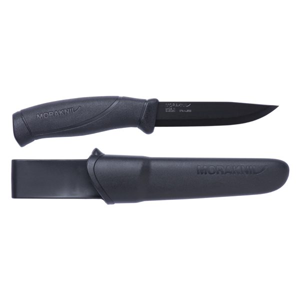 dunkelschwarzes Outdoormesser mit Köcher und Clip, mattschwarz