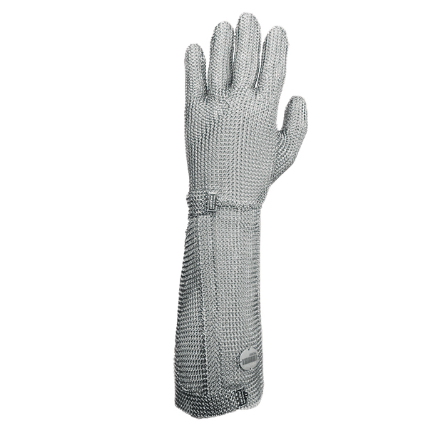 niroflex 2000 Greater comfort when worn due to soft, elastic cuff supports that prevent the cuff from slipping, can be worn on left and right. Coloured enforcements supports for quickly identifying sizes. Fastening strap made from ring mesh (Ø 4.2 mm/Wire thickness: 0.55 mm), patented fastening hook for easy and continuous adjustment. Extraordinary fit thanks to ergonomic design with no annoying mesh overhang over the fingertips. niroflex 2000 ring mesh gloves are approved according to DIN EN 1082-1 / ISO 13999-1, also available for delivery in detectable design.