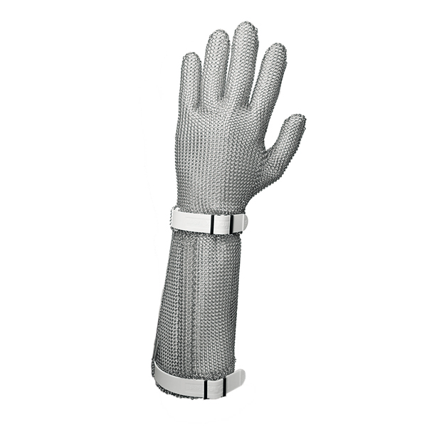 niroflex easyfit Flexible plastic supports for best possible comfort when worn, can be worn on left or right. Coloured replaceable straps for quickly identifying sizes; made from thermoplastic polyurethane (TPU) exchange-strap with push button buckle and optimal hygiene properties. Quickly and simply change straps without tools. Ring mesh (Ø 4.2 mm/Wire thickness: 0.55 mm). niroflex easyfit ring mesh gloves are approved according to DIN EN 1082-1 / DIN EN 14328 / DIN EN 1811 / ISO 13999-1, also available for delivery in detectable design