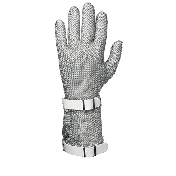 niroflex easyfit Bester Tragekomfort durch flexible Kunststoffstege, rechts und links tragbar. Farbige Wechselbänder für schnelle Größenidentifikation aus elastischem Thermo-Polyurethan (TPU) mit Druckknopfschnalle und optimalen Hygiene-Eigenschaften. Einfacher und schneller Bandwechsel ohne Werkzeuge. Ringgeflecht (Ø 4,2 mm/Drahtstärke 0,55 mm). niroflex easyfit-Ringgeflecht-Handschuhe sind geprüft nach DIN EN 1082-1 / ISO 13999-1, auch in detektierbarer Ausführung lieferbar.