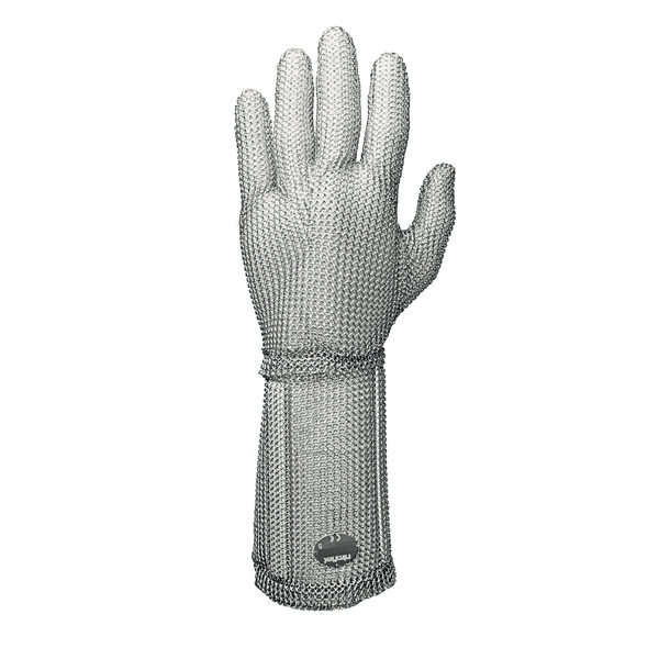 niroflex fix Very high quality thanks to microplasma welded ring mesh (Ø 4.0 mm/Wire thickness: 0.50 mm) – lightweight and with ideal hygienic requirements, can be worn on left or right. Coloured enforcements supports for quickly identifying sizes. Patented self-adjusting stainless steel spring lock, easy to put on and take off. niroflex fix ring mesh gloves are approved according to DIN EN 1082-1