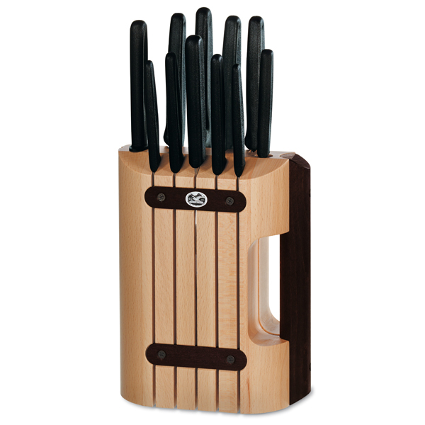 Buchenholz, Messer mit Standard-Griffen, schwarz, enthält: Sparschäler, 3 Gemüsemesser, Tomatenmesser, Brotmesser, 3 Tranchiermesser, Fleisch- und Bratengabel, Haushaltsstahl