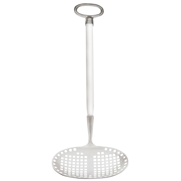 cast aluminium in oval, perforated shape, with white handle